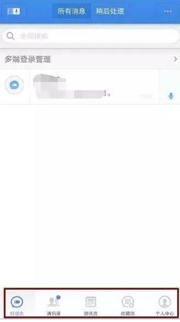 首頁(yè)進(jìn)去主要是消息管理,底部菜單分為對話(huà)、通訊錄、資訊、收藏和個(gè)人中心。
