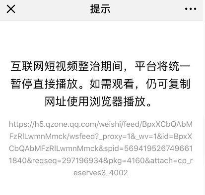經(jīng)新浪科技測試,發(fā)現確實(shí)有部分微視視頻在分享朋友圈和群組聊天后,可以直接打開(kāi)播放,而部分微視視頻分享微信后,點(diǎn)擊鏈接仍然顯示“互聯(lián)網(wǎng)短視頻整治期間,平臺將統一暫停直接播放”。