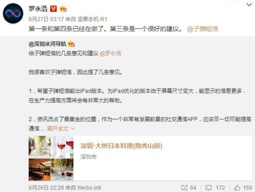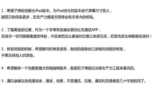 近日有網(wǎng)友在微博給出了關(guān)于子彈短信的幾條建議,沒(méi)想到竟然獲得了羅永浩的回復,下圖為網(wǎng)友提出的5點(diǎn)建議。