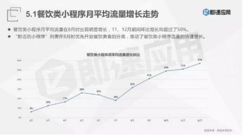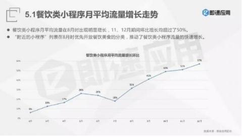 從即速應用發(fā)布的2017年小程序發(fā)展報告的總結中發(fā)現,餐飲類(lèi)小程序月平均流量在2017年9月時(shí)出現翻倍增長(cháng),11、12月期間環(huán)比增長(cháng)均超過(guò)了50%。目前相信餐飲小程序依然存在大幅增長(cháng)。