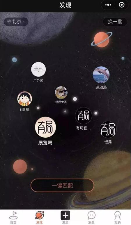 首先,在報名環(huán)節,這款小程序首頁(yè)上方的設定的「精選」、「玩桌游」、「動(dòng)起來(lái)」,可以供用戶(hù)根據所處地理位置和開(kāi)始時(shí)間進(jìn)行篩選,這些選項方便了不會(huì )主動(dòng)攢局的但又想參與的用戶(hù);另外,在小程序下方的「發(fā)現」欄中,用戶(hù)還可點(diǎn)擊一鍵匹配,系統會(huì )根據用戶(hù)的基本信息直接為其匹配到合適的局,用戶(hù)可以挑選進(jìn)入。