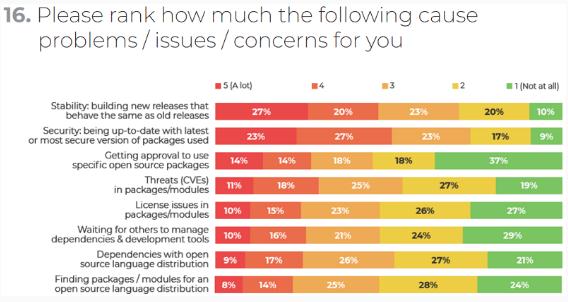 可以看到,穩定性和安全性是兩大困擾開(kāi)發(fā)者的問(wèn)題。開(kāi)發(fā)者表示在開(kāi)發(fā)中,遇到關(guān)于穩定性和安全性問(wèn)題的比例分別高達 50% 和 47%。這里穩定性方面的問(wèn)題是指新版本與舊版本之間的差異帶來(lái)的問(wèn)題,安全性是指需要使用最新或最安全版本的軟件包。