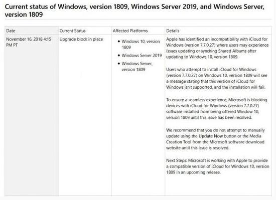 為了確保流暢體驗,微軟已經(jīng)阻止那些使用 iCloud for Windows(版本 7.7.0.27)的用戶(hù)升級 Windows 10 Version 1809。在這個(gè)問(wèn)題沒(méi)有得到徹底解決之前,需要使用 iCloud 服務(wù)的用戶(hù)盡量不要手動(dòng)升級或者使用媒體創(chuàng )作工具完全安裝。
