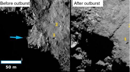 坍塌懸崖還幫助科學(xué)家更好地理解了 67P 的結構。圖像顯示彗星的材料非常脆弱。此外,懸崖沿著(zhù)弱點(diǎn)坍塌,導致從最初 70 米寬的坍塌發(fā)展為 2000 平方米區域的坍塌。此外,圖像顯示 67P 接近太陽(yáng)時(shí)增加的熱量使其更加活躍。在近日點(diǎn)之前和之后的圖像(彗星的軌跡使其最接近太陽(yáng)的點(diǎn))表明增加的活動(dòng)改變了表面的程度。