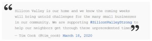 “硅谷是我們的家,我們知道未來(lái)幾周我們社區的許多小企業(yè)都會(huì )面臨無(wú)盡的挑戰。我們支持#SiliconValleyStrong 計劃,希望幫助我們的鄰居度過(guò)這個(gè)前所未有的時(shí)期。”庫克在 2020 年 3 月 18 日發(fā)推文稱(chēng)。