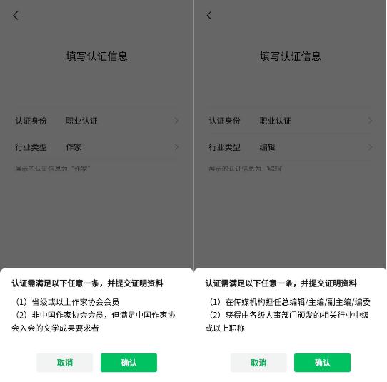 然后就是選擇認證形式,職業(yè)認證,對證件資質(zhì)要求比較高,比如認證作家,就需要你是作家協(xié)會(huì )成員,如果你認證編輯,那就得是某個(gè)媒體的編輯人員證件證明。