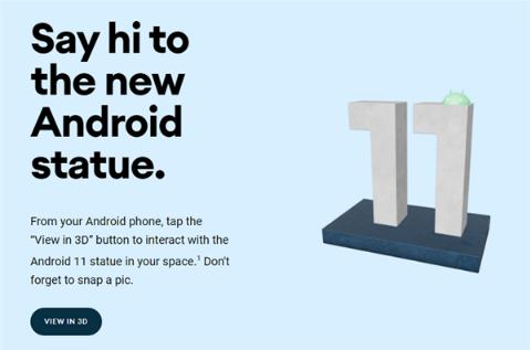 目前,谷歌在其官網(wǎng)上線(xiàn)了 Android 11 的 3D AR 雕像,可以讓用戶(hù)更好的去新上這個(gè)新版系統,同時(shí)位于加利福尼亞州的谷歌山景城總部,也已經(jīng)樹(shù)立了安卓 11 的實(shí)體雕像,雖然沒(méi)有了許多人熟悉的甜點(diǎn)代號造型(只有純數字 11),但綠色小機器人在 AR 頁(yè)面上還是表現得相當活躍。