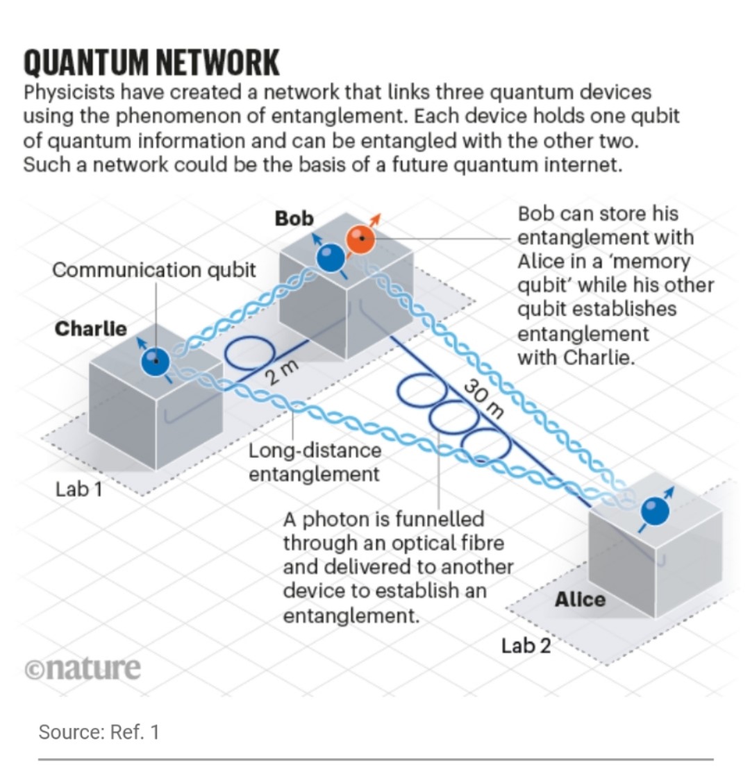 荷蘭代爾夫特理工大學(xué)的物理學(xué)家羅納德·漢森(Ronald Hanson)與他的合作者利用量子糾纏現象建立了連接三個(gè)量子設備的網(wǎng)絡(luò )。每個(gè)設備持有一個(gè)量子比特的信息,可以與另外兩個(gè)發(fā)生糾纏。這樣的網(wǎng)絡(luò )可以成為未來(lái)量子互聯(lián)網(wǎng)的基礎。