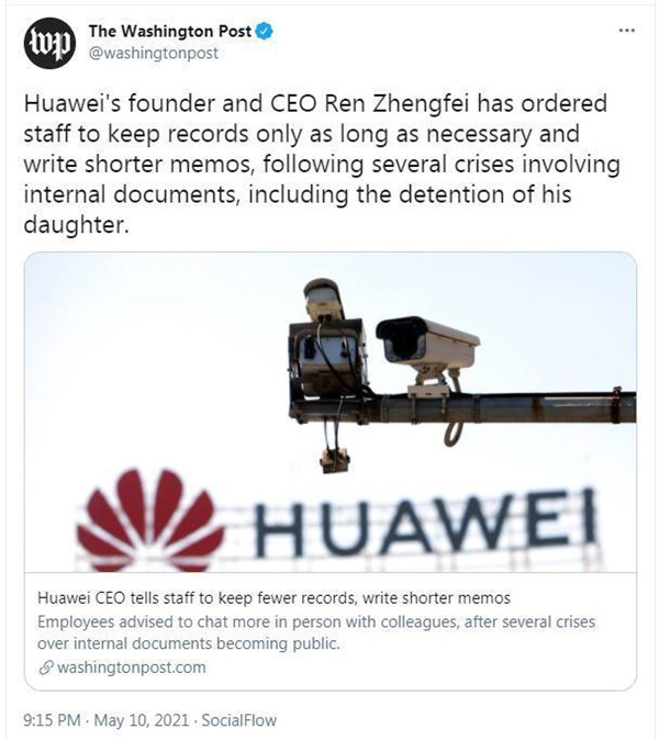 推文譯文:在發(fā)生了幾次涉及內部文件危機事件之后(包括他女兒被拘押),華為創(chuàng )始人兼首席執行官任正非已命令員工只保留必要的記錄,并寫(xiě)更短的備忘錄。
