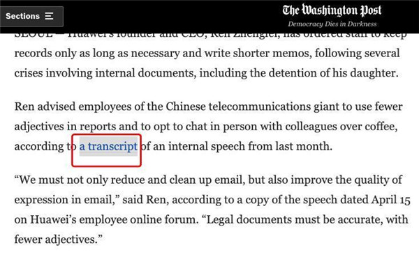 但令人遺憾的是,《華盛頓郵報》這篇報道里,對于新華社記者輕易就在同一個(gè)論壇里搜索出來(lái)的眾多歷史文件“視而不見(jiàn)”,非要把華為一貫的工作斷章取義、錯置語(yǔ)境為“新聞”,把精簡(jiǎn)文件、提高效率的措施“嫁接”到所謂華為躲躲藏藏、居心不良、謹防麻煩的背景里,實(shí)在令人無(wú)語(yǔ),也對《華盛頓郵報》這家媒體的用心打了大大的問(wèn)號。