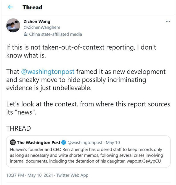 王子辰在推特上說(shuō):如果這不是斷章取義,我真的不知道還有什么能算斷章取義了……《華盛頓郵報》的報道把華為的這一情況描繪成新鮮事以及偷偷摸摸隱藏潛在犯罪證據,實(shí)在令人難以置信。