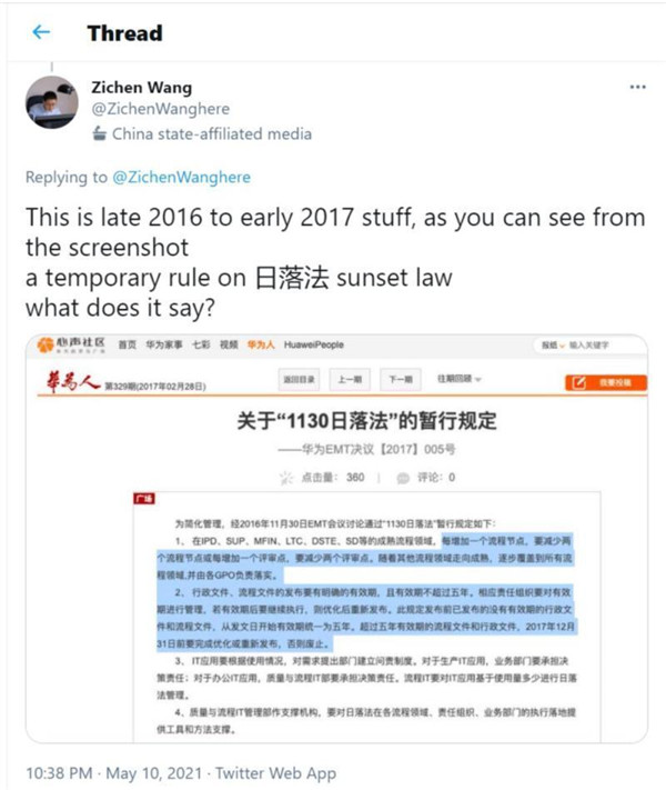事實(shí)上,華為至少早在2017年就提出了“日落法”。如果在《華盛頓郵報》文中鏈接指向的華為“心聲社區”里搜索“日落法”,能搜到華為公司近年來(lái)很多類(lèi)似內容,比如: