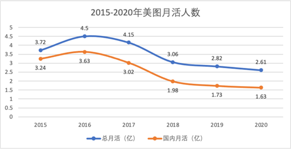 而根據最新的財報,美圖的總月活數已經(jīng)連續5年下跌,國內月活數量較最高時(shí)下跌了近一半。
