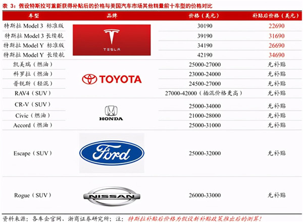 對比特斯拉Model 3 和Model Y補貼前的價(jià)格和美國汽車(chē)市場(chǎng)其他銷(xiāo)量前十車(chē)型的售價(jià),特斯拉車(chē)的價(jià)格還是高出17%~31%。也就是說(shuō),特斯拉離大眾都能買(mǎi)得起車(chē)的價(jià)格,還差一步。