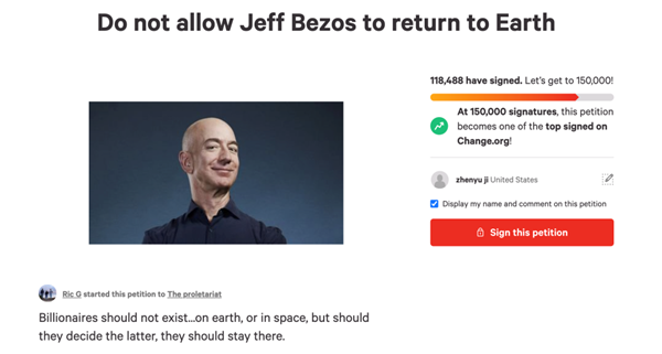 然而就在這一宏偉計劃對外公布后不久,外界卻出現了不和諧的音符。兩周前,在請愿網(wǎng)站Change.org上,有一位用戶(hù)名為Ric G的用戶(hù),發(fā)起了一項名為“不要讓貝索斯回歸地球”的請愿,請愿的對象是“無(wú)產(chǎn)階級”。他所闡述的理由是:億萬(wàn)富翁不應該存在于地球上或者是太空里,但如果他們選擇后者,那么他們應該留在那里。