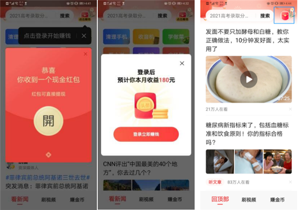 今日頭條與抖音同屬于字節系,兩個(gè)平臺的內容屬性、推薦原理具有極大的相似性。今日頭條大字版已經(jīng)上線(xiàn),光子星球使用后發(fā)現,打開(kāi)APP首先跳出來(lái)的是一個(gè)待開(kāi)的紅包,一時(shí)間誤以為自己進(jìn)了拼多多,繼續操作發(fā)現,平臺是想通過(guò)紅包引導用戶(hù)注冊登錄,玩著(zhù)刷內容賺錢(qián)的老套路。