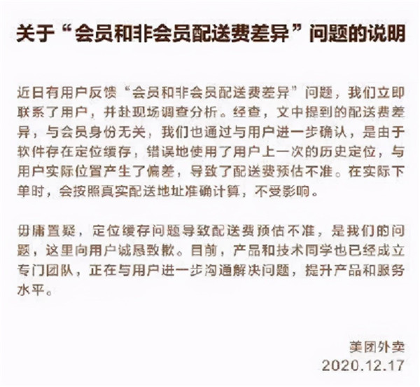 比如,針對網(wǎng)友“漂移神夫”的說(shuō)法,美團給出的回應是,預估配送費差異與會(huì )員身份無(wú)關(guān),是定位緩存偏差導致。用戶(hù)實(shí)際下單的配送費,會(huì )按照真實(shí)配送地址準確計算,不受影響。