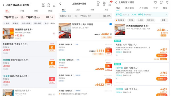 7月2日上午顯示的上海外灘W酒店外灘景觀(guān)壯美客房預訂價(jià)格截圖,從左至右分別為:美團、攜程、去哪兒。