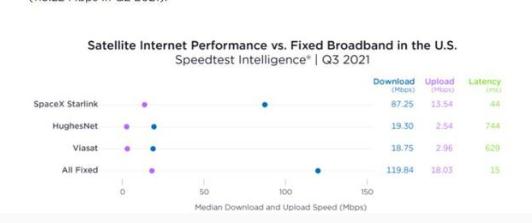 在美國,希望使用衛星互聯(lián)網(wǎng)服務(wù)的消費者發(fā)現,與 2021 年第二季度相比,第三季度網(wǎng)速基本持平。星鏈的下載速度中值從 2021 年第二季度的 97.23 Mbps 降至 2021 年第三季度的 87.25 Mbps,這可能是增加更多客戶(hù)所致。