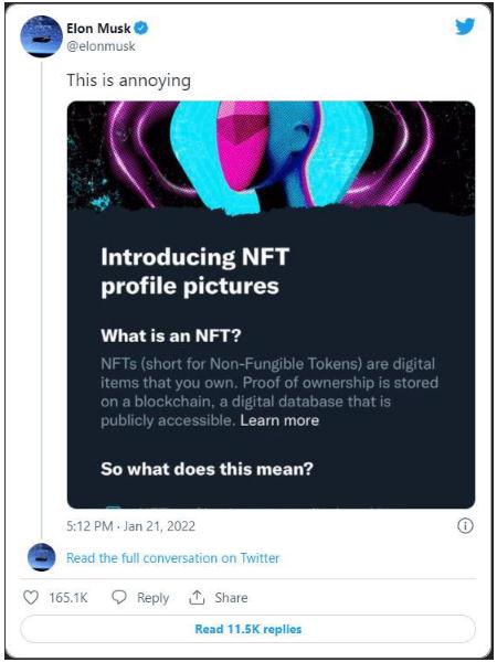1月22日消息,據外媒報道,美國當地時(shí)間周四,社交媒體推特宣布將在其訂閱服務(wù)Twitter Blue上推出一項計劃,讓iOS用戶(hù)使用NFT作為他們的頭像。特斯拉首席執行官埃隆·馬斯克(Elon Musk)隨后立即表達了自己的不滿(mǎn),批評其浪費資源。