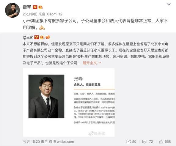 而雷軍隨后也轉發(fā)了王化的微博并表示:小米集團旗下有很多家子公司,子公司董事會(huì )和法人代表調整非常正常,大家不用誤解。