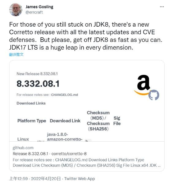 不過(guò)醉翁之意不在酒,原來(lái) Java 之父只是為了給東家 AWS 的 OpenJDK 發(fā)行版 Corretto “帶貨”,他建議仍在使用 JDK 8 的開(kāi)發(fā)者可以考慮使用 Corretto 的新版本——包含了所有最新的更新和 CVE 防御。Corretto 是亞馬遜推出的 OpenJDK 8 的發(fā)行版,它支持多種平臺,可以在云端與本地計算機上運行。每個(gè) Corretto 版本上都會(huì )運行技術(shù)兼容性工具包(Technology Compatibility Kit,TCK),以確保與 Java SE 平臺相兼容。在不使用到 OpenJDK 中沒(méi)有的功能(例如 Java Flight Recorder)的情況下,Corretto 完全可以直接作為 Java SE 發(fā)行版的替代品。