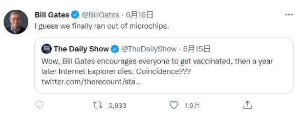 微軟永久關(guān)閉 IE 瀏覽器,公司創(chuàng )始人比爾?蓋茨(Bill Gates )在個(gè)人社交媒體推特上開(kāi)玩笑說(shuō),微軟之所以關(guān)閉 IE 瀏覽器是因為“微芯片被用完了”。