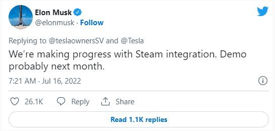 據報道,特斯拉 CEO 埃隆·馬斯克發(fā)推稱(chēng),整合游戲平臺 Steam 的工作取得進(jìn)展,下個(gè)月可能就會(huì )演示。