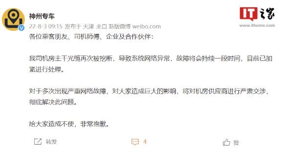 神州專(zhuān)車(chē)表示,給大家造成不便,非常抱歉。對于多次出現嚴重網(wǎng)絡(luò )故障,對大家造成巨大的影響,將對機房供應商進(jìn)行嚴肅交涉,徹底解決此問(wèn)題。