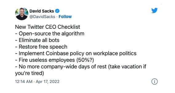 推特在傳票中提到了薩克斯的幾條推文,其中一條是他為推特下一任 CEO 列出的任務(wù)清單。