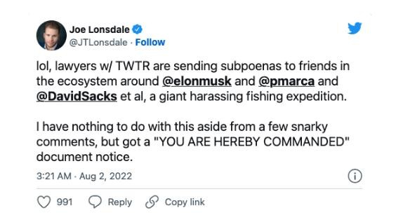 上周,曾與馬斯克在 5 月份一起出席 All-In 峰會(huì )的投資者喬?朗斯代爾 (Joe Lonsdale) 在推特上稱(chēng),傳票是一次“巨大的騷擾性非法調查”。