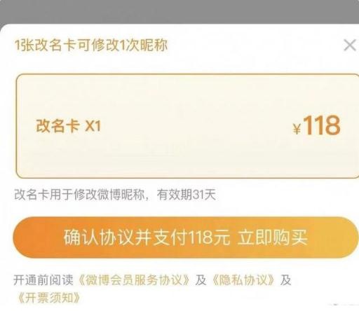 昨日晚間有大量網(wǎng)友發(fā)現微博新推出了改名卡服務(wù),該卡售價(jià) 118 元一張,有效期 31 天,一張改名卡可修改昵稱(chēng)一次。但現在微博已經(jīng)宣布下架改名卡服務(wù),并稱(chēng)功能上存在問(wèn)題。