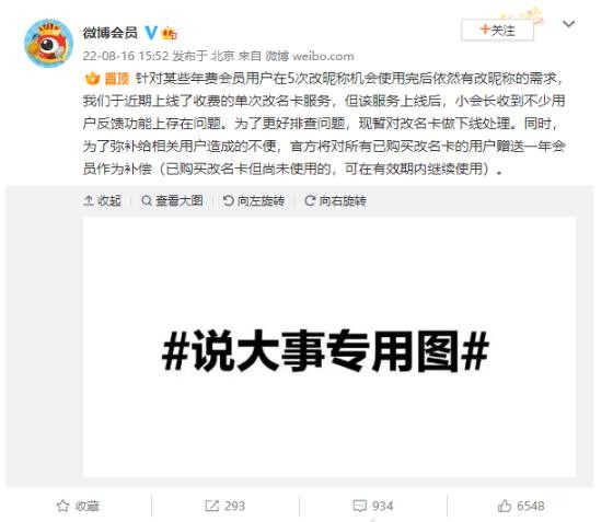 官方還表示,為了彌補給相關(guān)用戶(hù)帶來(lái)的不便,將對所有已購買(mǎi)改名卡的用戶(hù)贈送一年微博會(huì )員作為補償,同時(shí)已購買(mǎi)但尚未使用的改名卡,可以在有效期內繼續使用。