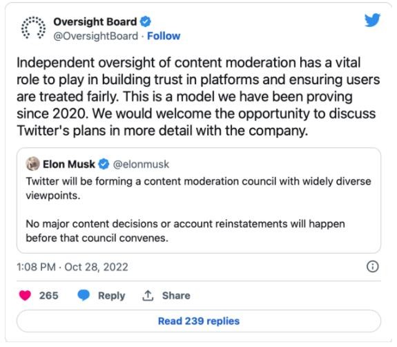 目前馬斯克還沒(méi)有透露推特內容審核委員會(huì )如何組建的相關(guān)信息。未來(lái)推特是否會(huì )顯著(zhù)改變內容審核政策,恢復特朗普等爭議賬號,將直接取決于這些委員的立場(chǎng)與背景。顯然,這個(gè)委員會(huì )的人員組成將成為美國社會(huì )左右兩派的關(guān)注焦點(diǎn)。有趣的是,Facebook 內容審核委員會(huì )也轉發(fā)了馬斯克的推文,歡迎推特也借鑒他們的模式。
