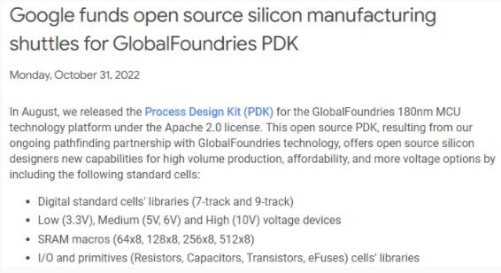 今年 8 月,谷歌宣布與 GlobalFoundries (格羅方德半導體股份有限公司)的合作伙伴關(guān)系,GlobalFoundries 為谷歌的開(kāi)源芯片計劃提供 180nm 的制造訪(fǎng)問(wèn)權限。