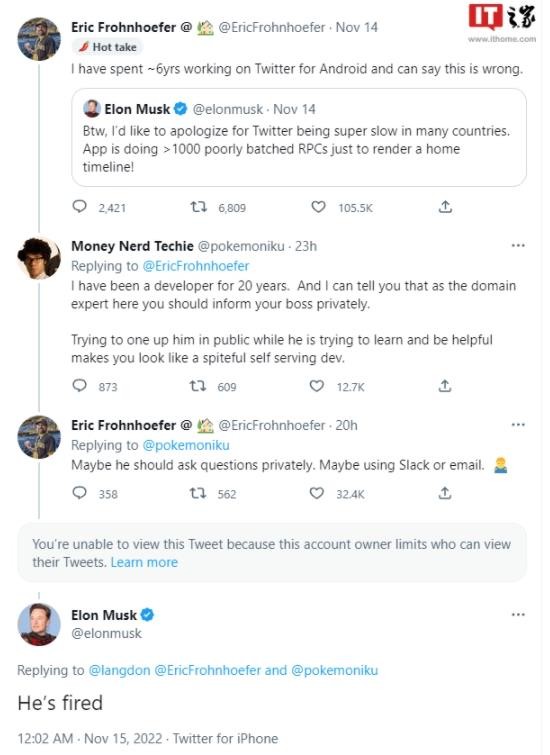 馬斯克和 Frohnhoefer 之間的對話(huà)很混亂,Twitter 的設計也讓人不太好理清這些對話(huà)。馬斯克在其中一條回復中問(wèn) Frohnhoefer,他個(gè)人做了什么來(lái)解決 Twitter 在安卓系統上速度慢的問(wèn)題。事情的最后,有一位網(wǎng)友說(shuō),Frohnhoefer 應該在私下給他的老板糾正錯誤,而不是公共平臺上,Frohnhoefer 則非常硬氣地回復稱(chēng)也許馬斯克也應該在私下提出問(wèn)題,最后馬斯克回復說(shuō):“他被解雇了。”