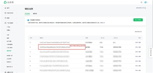 6.我們回到模板消息列表就可以看到添加的這條模板消息,復制模板ID到推送消息的程序里即可。