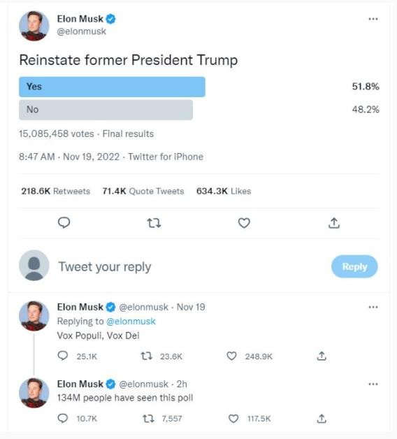 在得到這一結果后,馬斯克發(fā)布消息,稱(chēng)自己將根據網(wǎng)民們的意愿解封特朗普的個(gè)人賬號,他還用一句拉丁語(yǔ)格言表達了自己對這一決定的看法:Vox Populi, Vox Dei.(意為“人民的聲音就如同神的旨意”)。