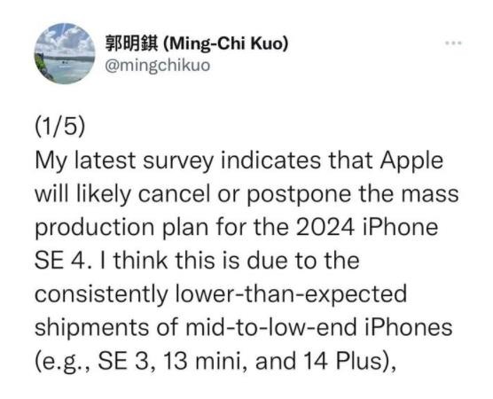 天風(fēng)證券分析師郭明錤在個(gè)人社交賬號分享了關(guān)于蘋(píng)果的最新動(dòng)態(tài),按照iPhone 14與iPhone 14 Plus的實(shí)際市場(chǎng)表現來(lái)看,原定于2024年發(fā)布的iPhone SE第四代或許會(huì )被延期至2024年后,最壞的情況是終止項目的推進(jìn)。據悉,iPhone SE第四代將采用劉海屏設計,徹底拋棄非全面屏造型。