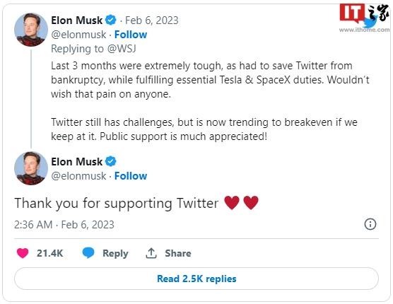 他寫(xiě)道:“我不希望任何人遭受這種痛苦。推特仍然有挑戰,但如果我們堅持下去,它現在的趨勢是收支平衡。非常感謝公眾的支持!”