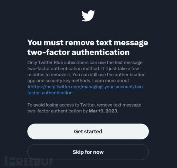 3 月 20 日開(kāi)始,不再支持普通用戶(hù)基于短信的雙因素身份驗證(2FA)方式,只有購買(mǎi) Twitter Blue 服務(wù)的訂閱用戶(hù)才能繼續使用。