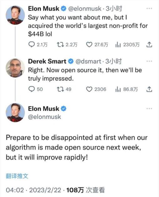 馬斯克回復用戶(hù)推文時(shí)表示 推特將下周開(kāi)源算法 15:05:26