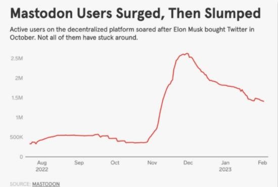 去年 12 月,Mastodon 的月活躍用戶(hù)從 38 萬(wàn)攀升至 250 萬(wàn)以上,但它并沒(méi)有讓人們堅持用下來(lái)。由于 Mastodon 是由一群技術(shù)極客實(shí)現的,面向的群體為 Web3 原生用戶(hù),產(chǎn)品具有較高的操作門(mén)檻,很多新手抱怨“實(shí)在難用”,于是他們又回到了自己熟悉的 Twitter。 到了 2023 年 1 月底,Mastodon 的每月活躍用戶(hù)數下降到 140 萬(wàn)。