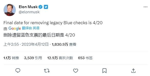 埃隆?馬斯克(Elon Musk)在最新推文中宣布,將于 4 月 20 日之前完成遺留 Twitter 賬號的清理工作,確保尚未購買(mǎi) Twitter Blue 服務(wù)的賬號不會(huì )顯示藍色驗證徽章。