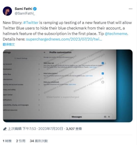 媒體今年 3 月報道,推特即將為 Twitter Blue 用戶(hù)推出個(gè)性化服務(wù),允許隱藏藍 V 徽章。