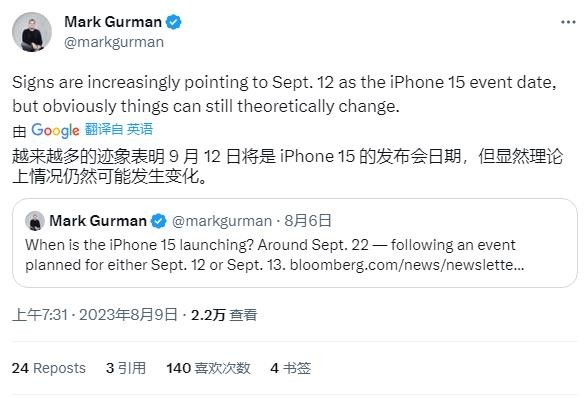 翻譯古爾曼的推文內容如下:“越來(lái)越多的跡象表明,蘋(píng)果已挑選 9 月 12 日星期二,來(lái)發(fā)布 iPhone 15 系列。不過(guò)理論上蘋(píng)果也會(huì )做出調整”。