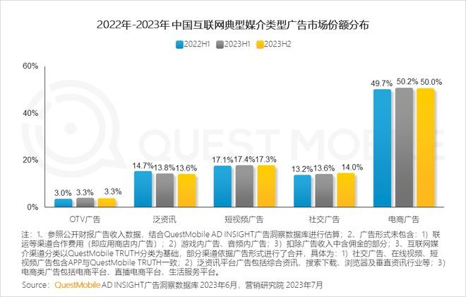 根據 QuestMobile 報告顯示,今年上半年,互聯(lián)網(wǎng)廣告的市場(chǎng)份額未有明顯變化,占比前三的依舊是電商廣告(50.0%)、短視頻廣告(17.3%)和泛資訊廣告(13.6%)。