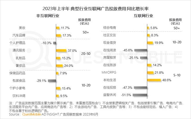 QuestMobile 數據顯示,2023 年上半年,本地生活賽道互聯(lián)網(wǎng)廣告投放費用同比增長(cháng) 48.6%,排名最高,美團今年上半年的廣告收入增速排在第三位。