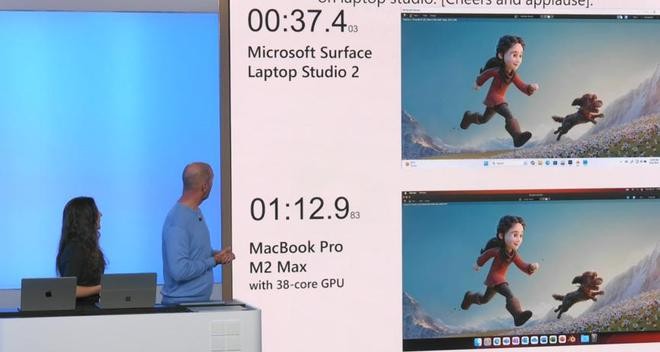 非常有趣的是,微軟也在現場(chǎng)拿著(zhù) Surface Laptop Studio 2 與搭載著(zhù) M2 Max 芯片的 MacBook Pro 進(jìn)行渲染任務(wù)測試。在英偉達 GPU 的助力下,在這個(gè)項目上 Surface 呈現出了強一倍的表現。