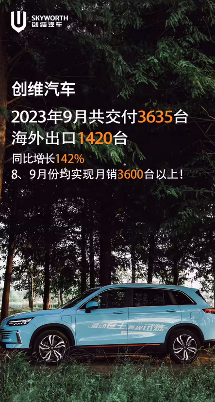 創(chuàng )維汽車(chē) 9 月交付 3635 臺,同比增長(cháng) 142%